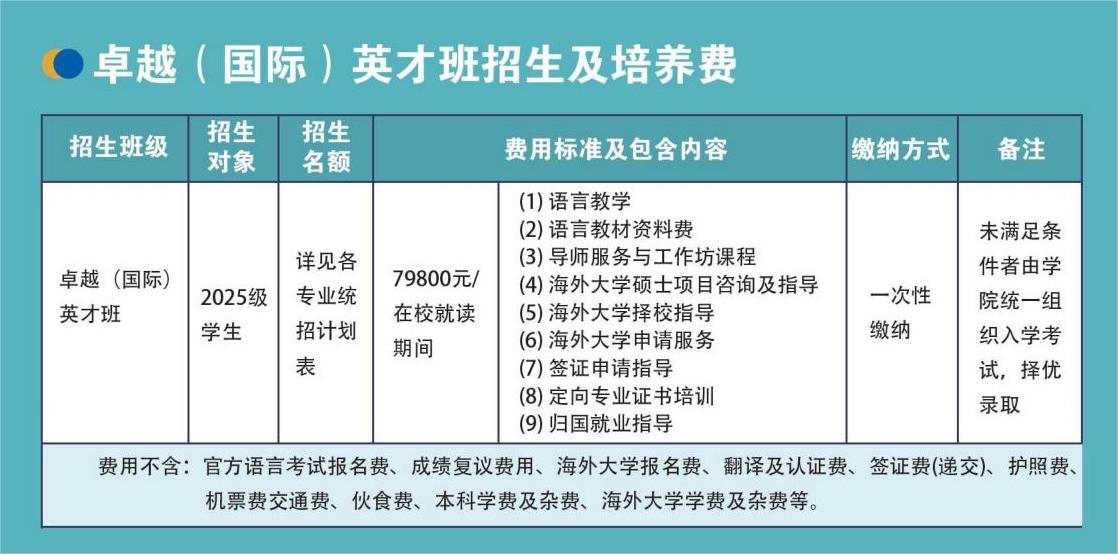 我校2025年所有本科专业均设国内班(四年国内本科)和卓越(国际)班(大一入校学生修读雅思及国外合作院校相关课程,四年国内毕业后去海外院校攻读硕士学位)方向,学生大一入校前自主选择专业方向。